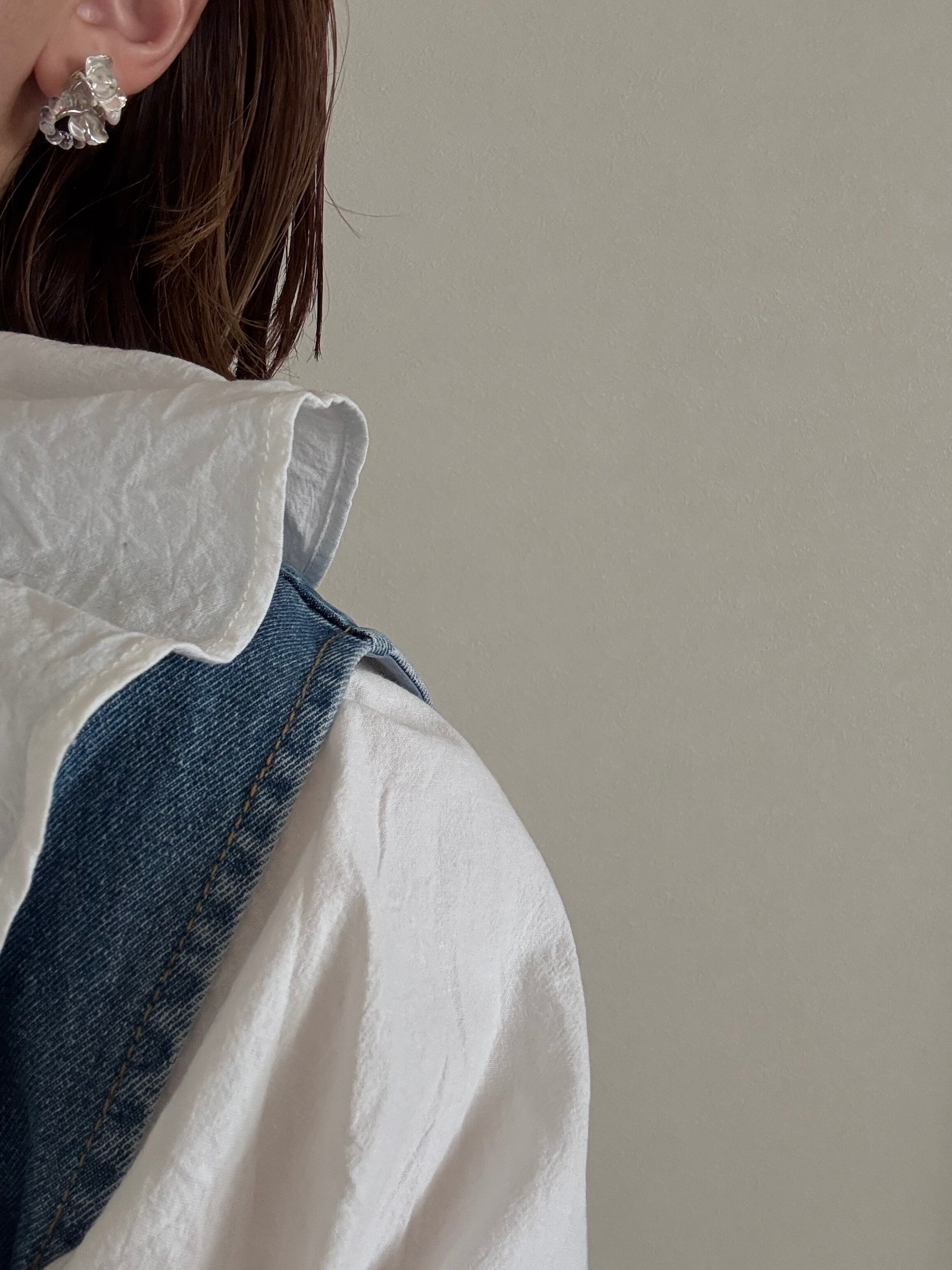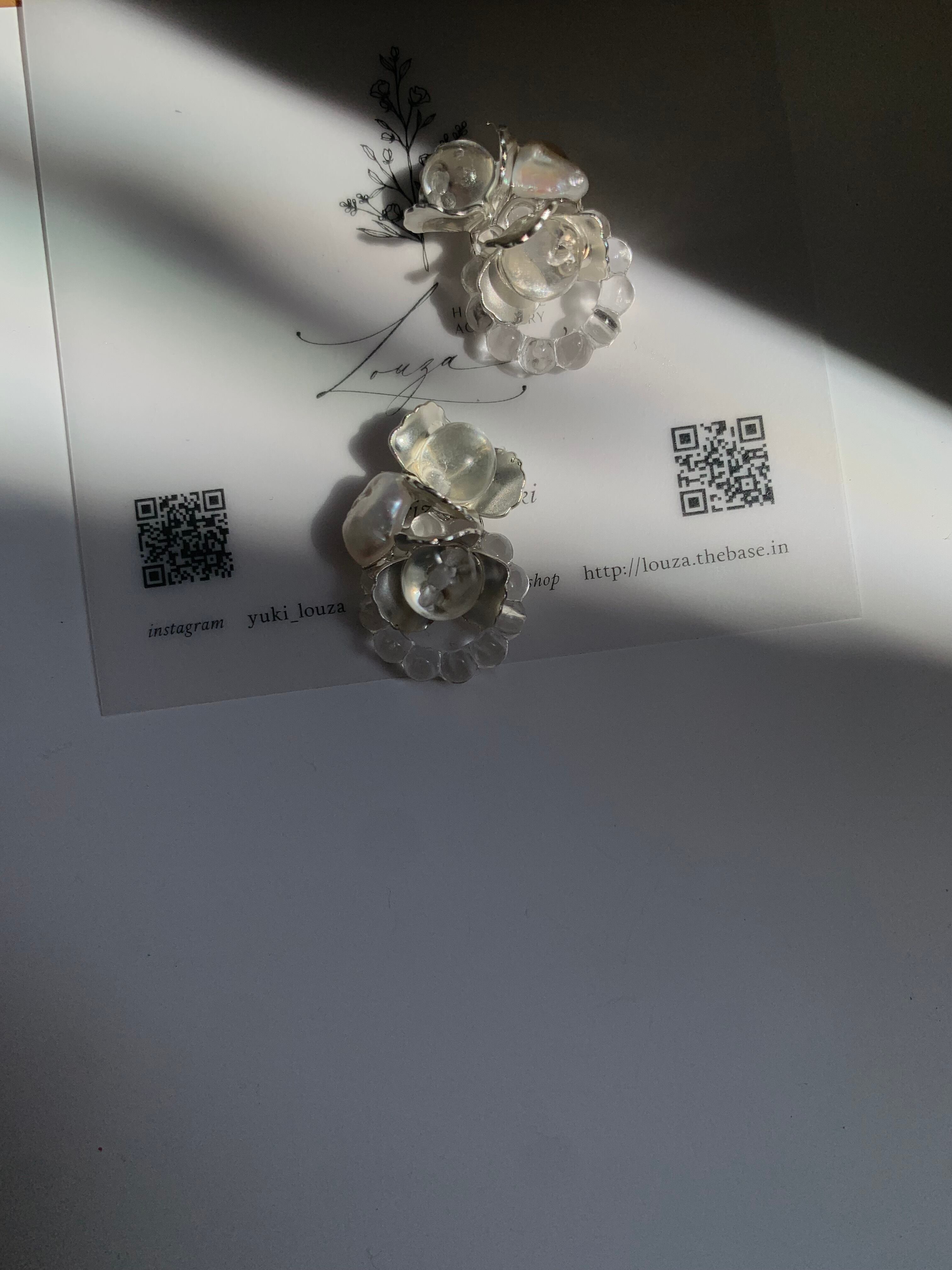 アンバランスに添えたマットシルバーの花びら、淡水パールを一粒ずつ、個性的なクリアパーツを組み合わせ、透明感たっぷりなクールで上品なデザインに仕上がりました。