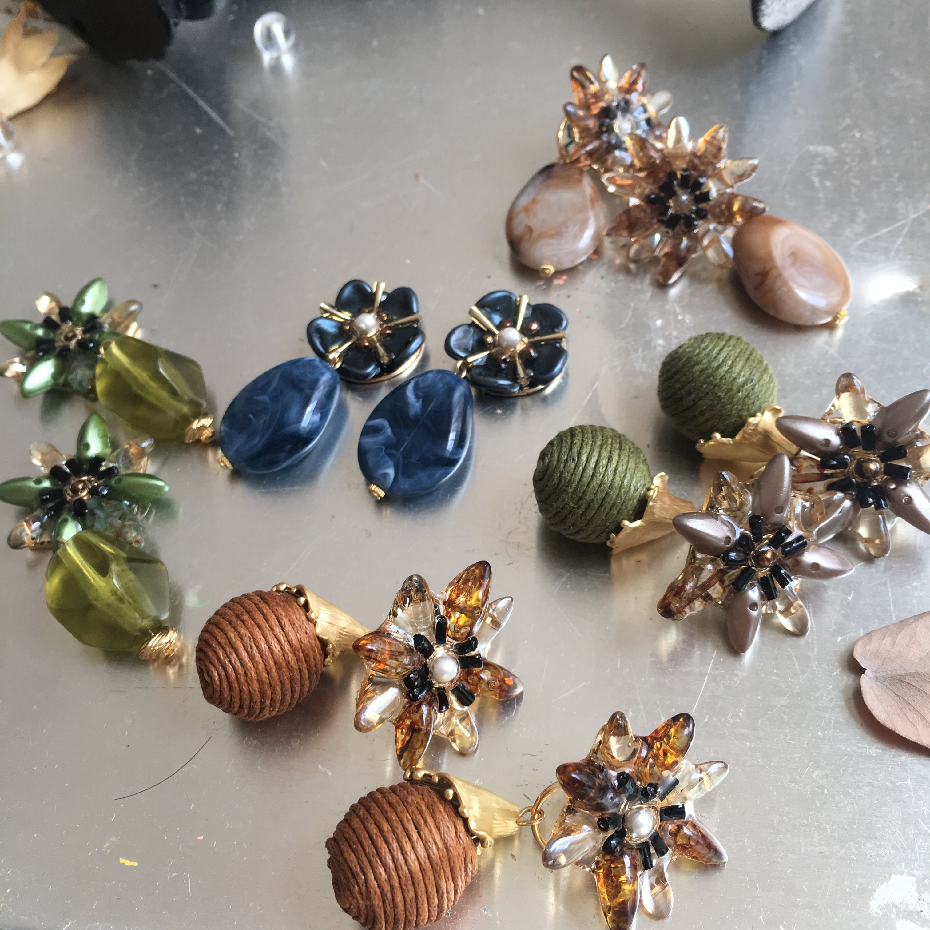 秋冬にむけて、グリーン系のチェコビーズを2種類使いお花を作りました。