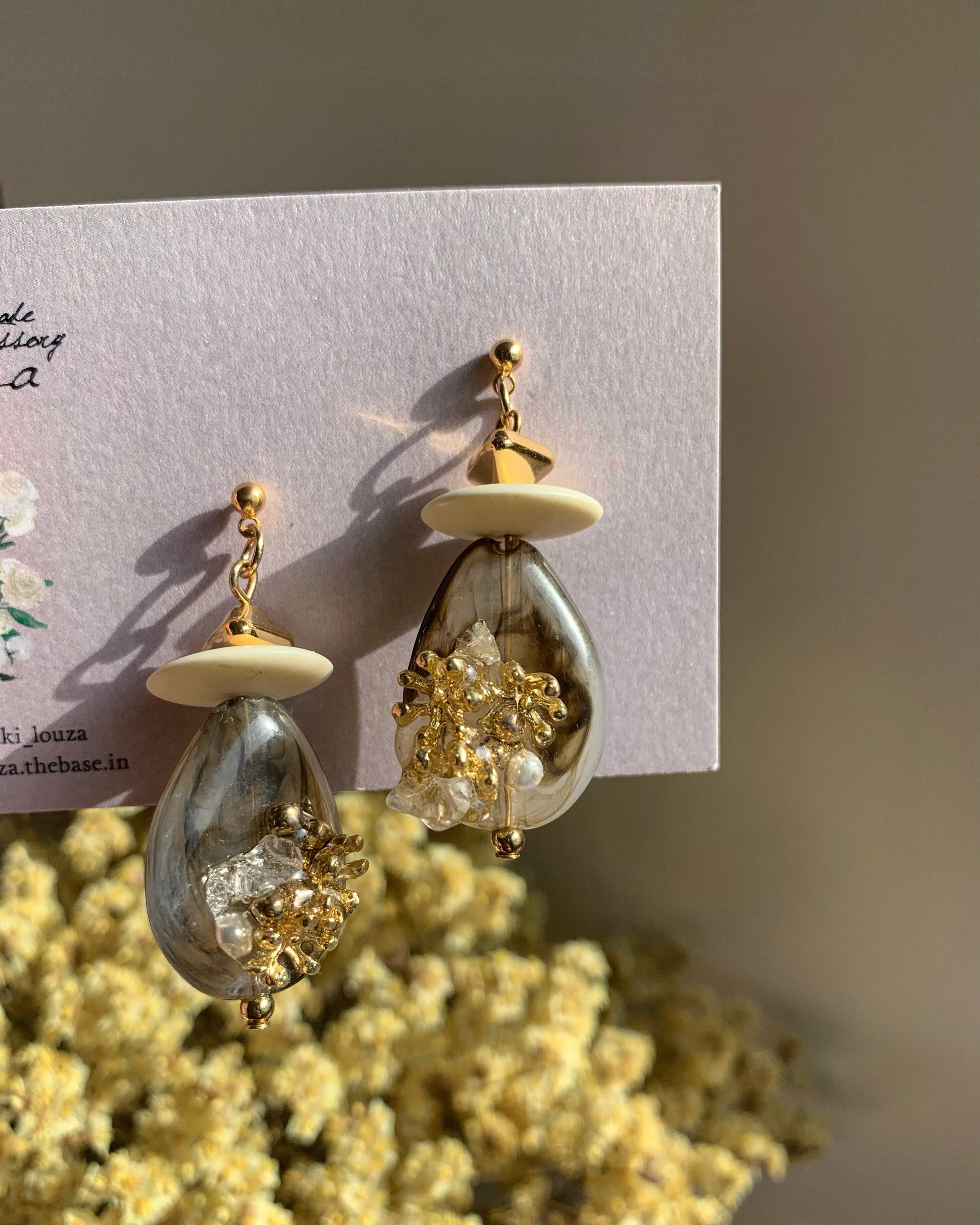 ドイツ製ヴィンテージのマーブル模様が綺麗なパーツに小さなビーズなどを使用してニュアンスフラワーをデザインしました。