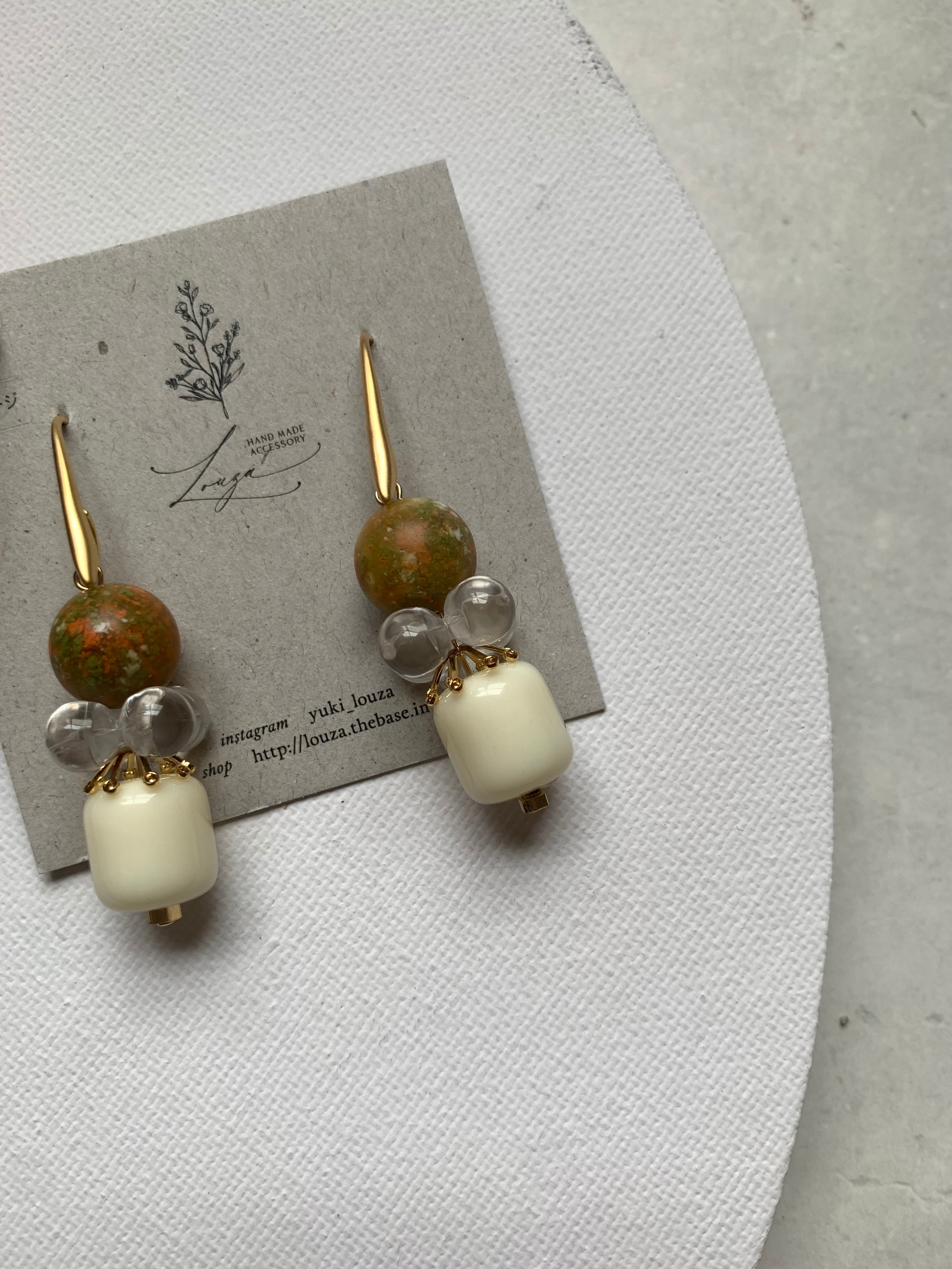 全体的にコロンとしたデザインが可愛らしくもあり、大人な雰囲気の中に遊び心をも備えたピアスです。