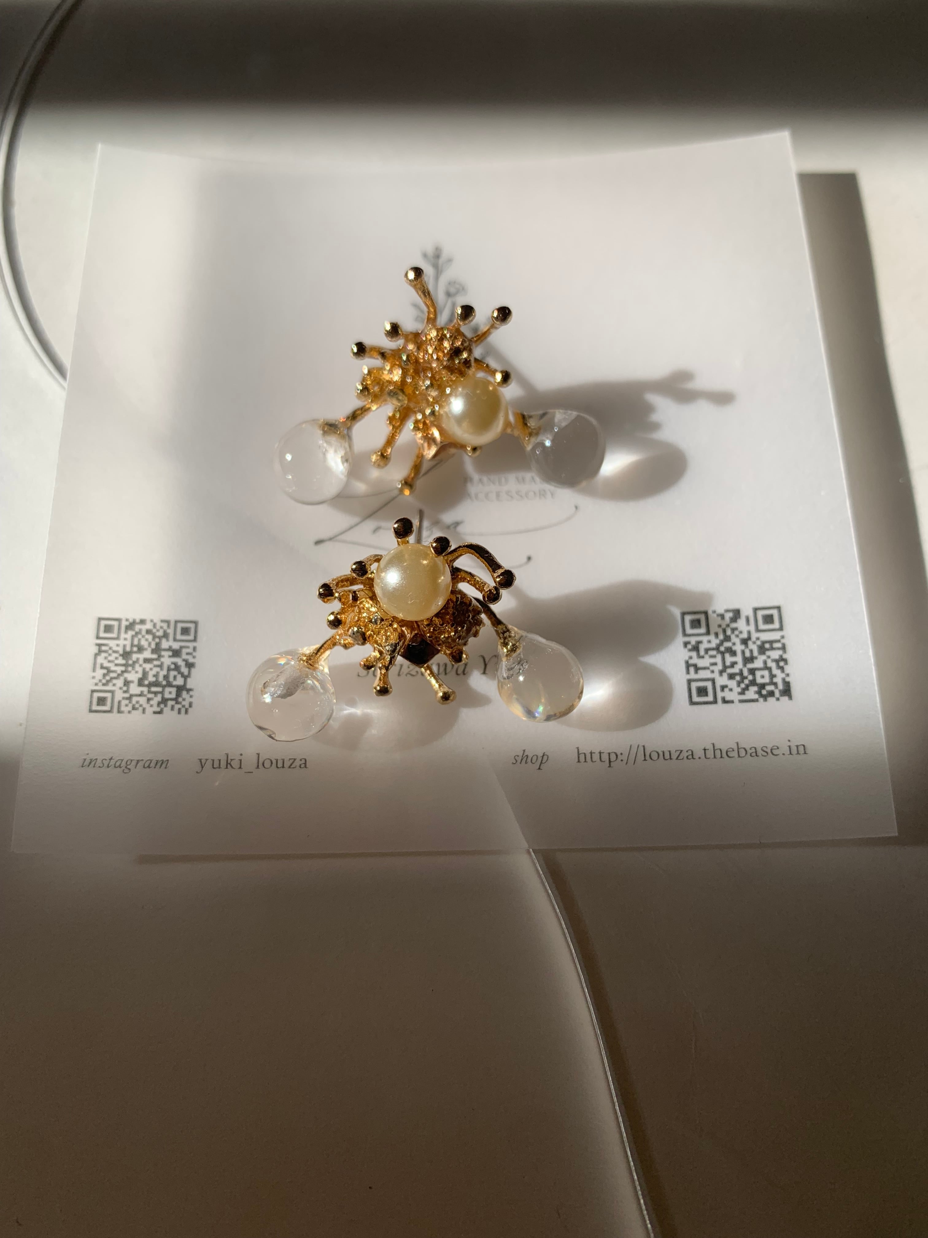 立体的なフラワー真鍮ピアスに、Louzaらしいビジューデザインを施しました。