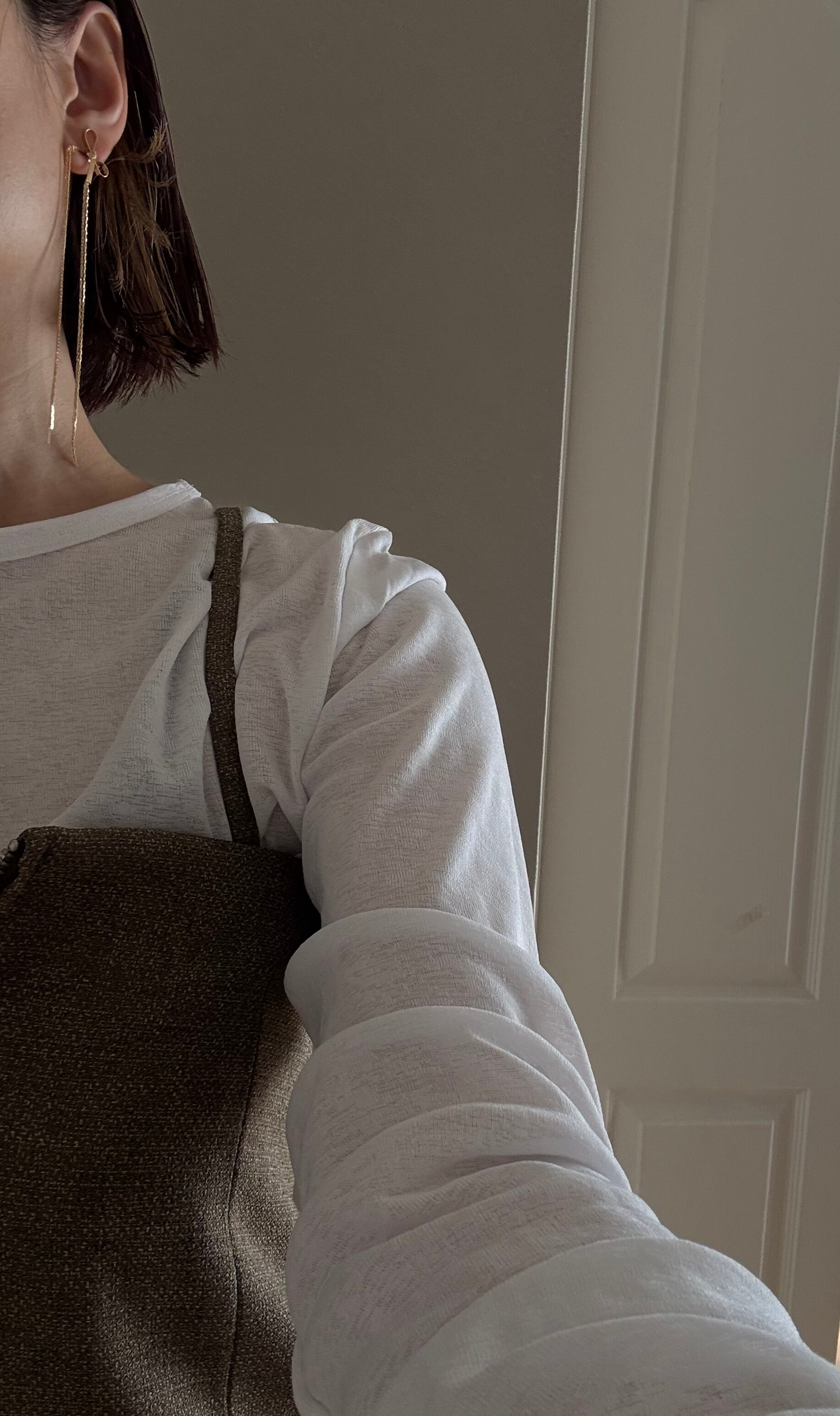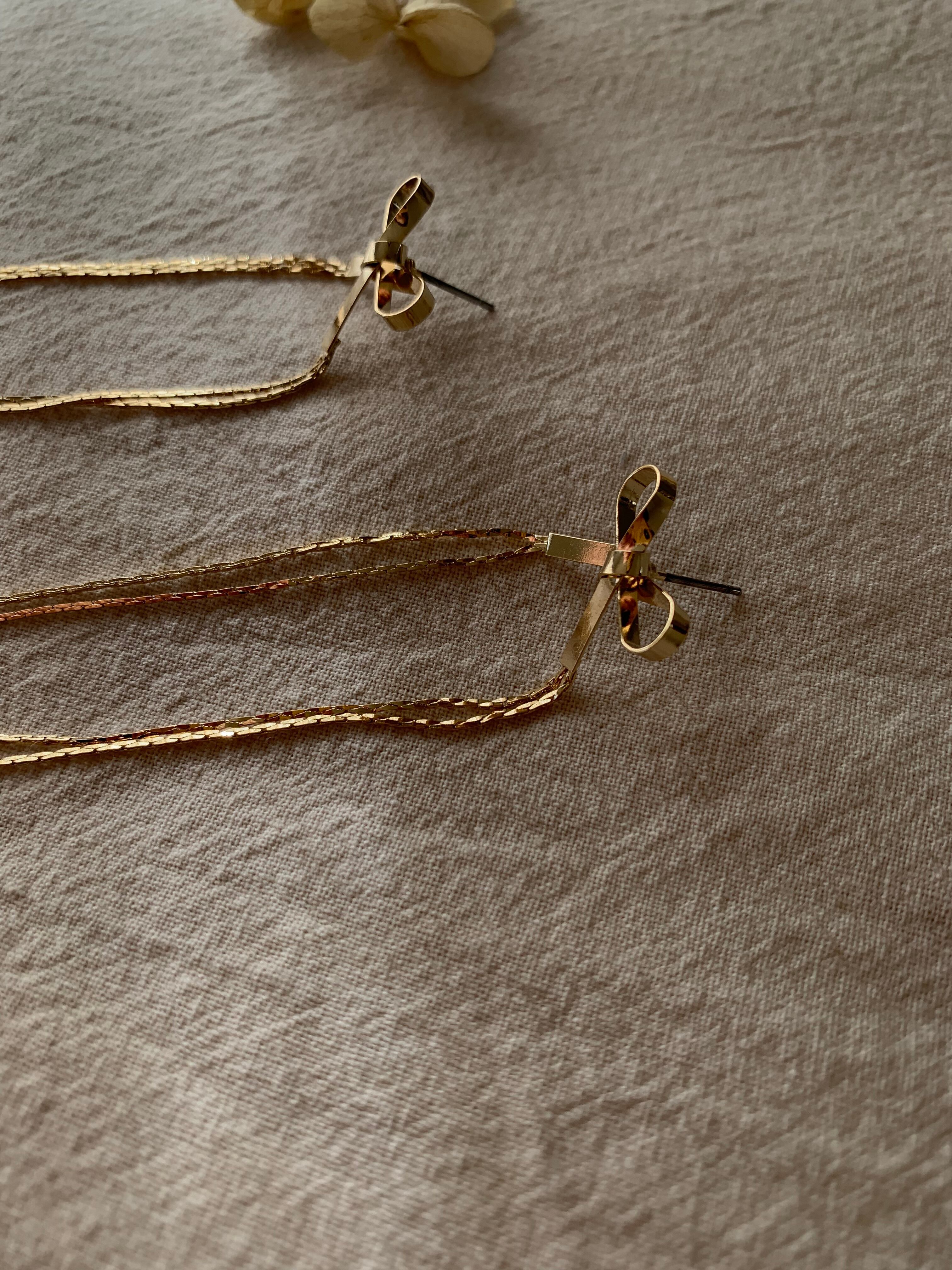 耳下からロングチェーンがストンと伸び、チェーン先が繊細にキラキラ、ゆらゆらと揺れます。