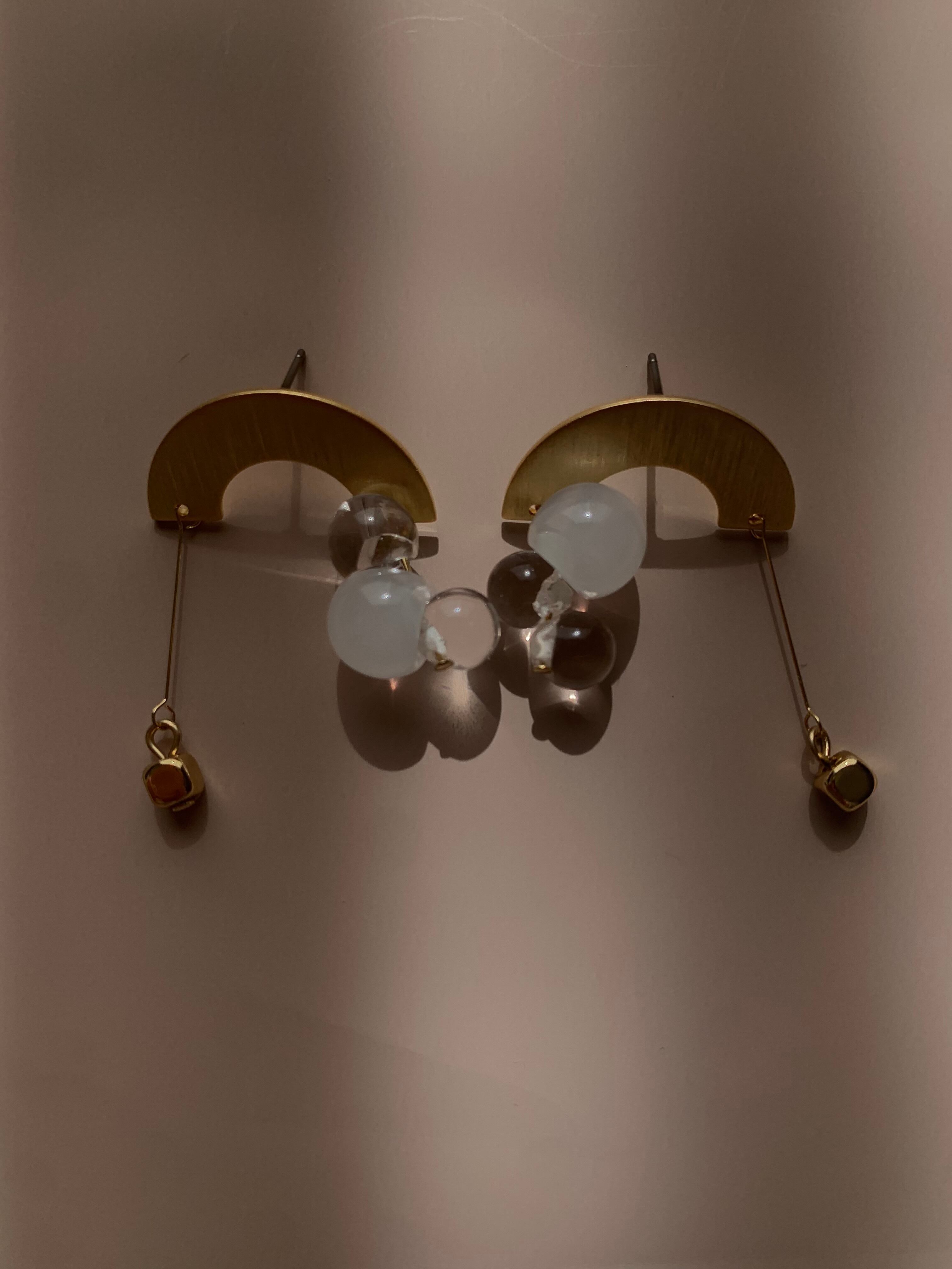 半円を描くフォルムのマットゴールドピアスに泡のようなぷくぷくビーズを合わせました。